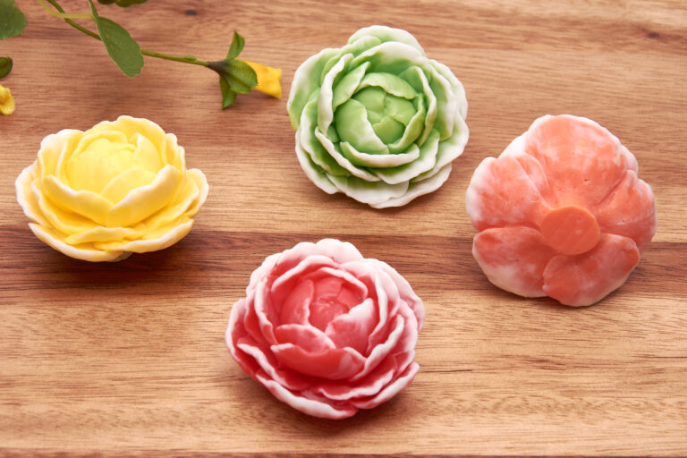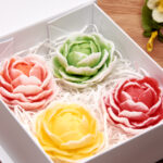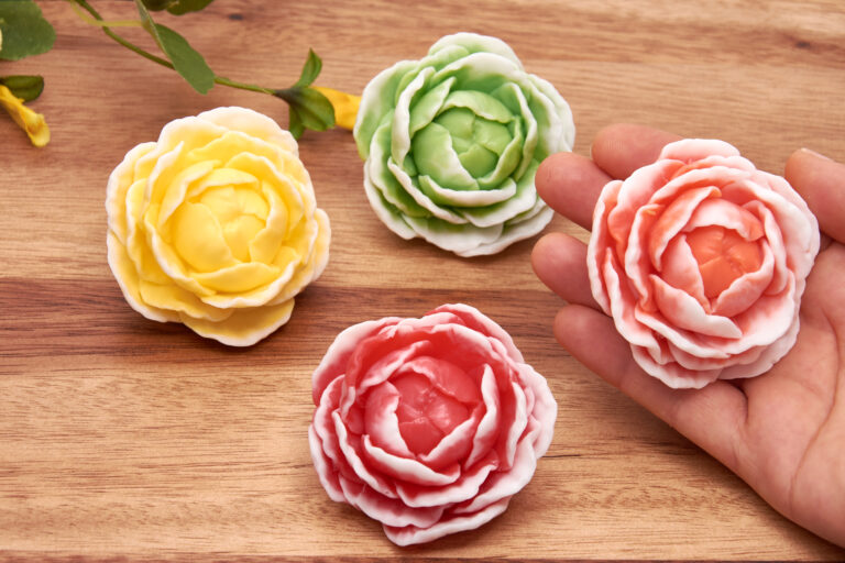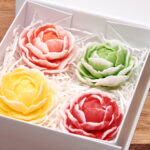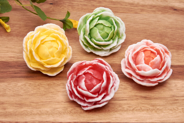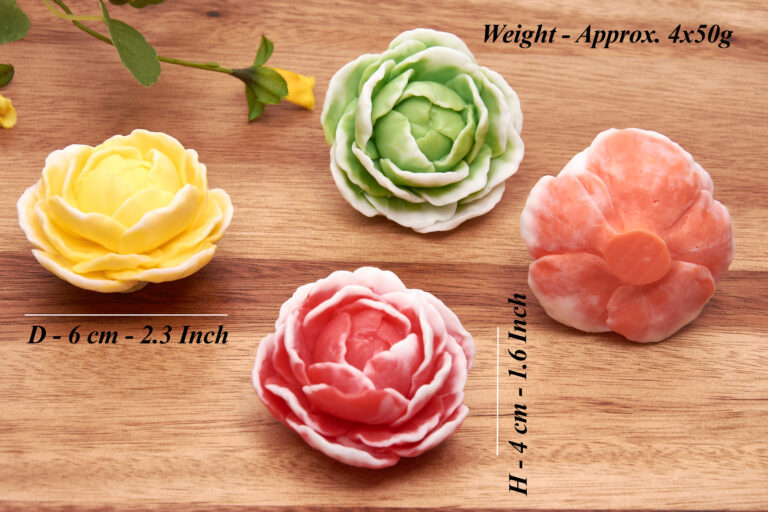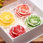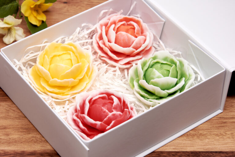 Indulge yourself with this set of colourful peony soap flowers, lovingly handmade. Each flower is crafted from a high-quality soap base enriched with organic shea butter and delicately fragranced — choose your favourite scent from our selection to make every use a special moment.