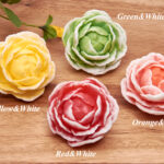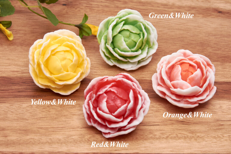 – 4 peony soap flowers in the following two-tone colour combinations: