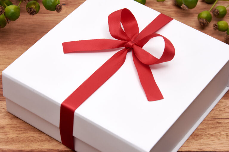 The flowers are presented on a bed of shredded white paper inside a luxurious white gift box, decorated with a red satin ribbon — ready to give as a gift with no extra wrapping needed. All products are carefully wrapped in protective film to ensure they arrive safely.