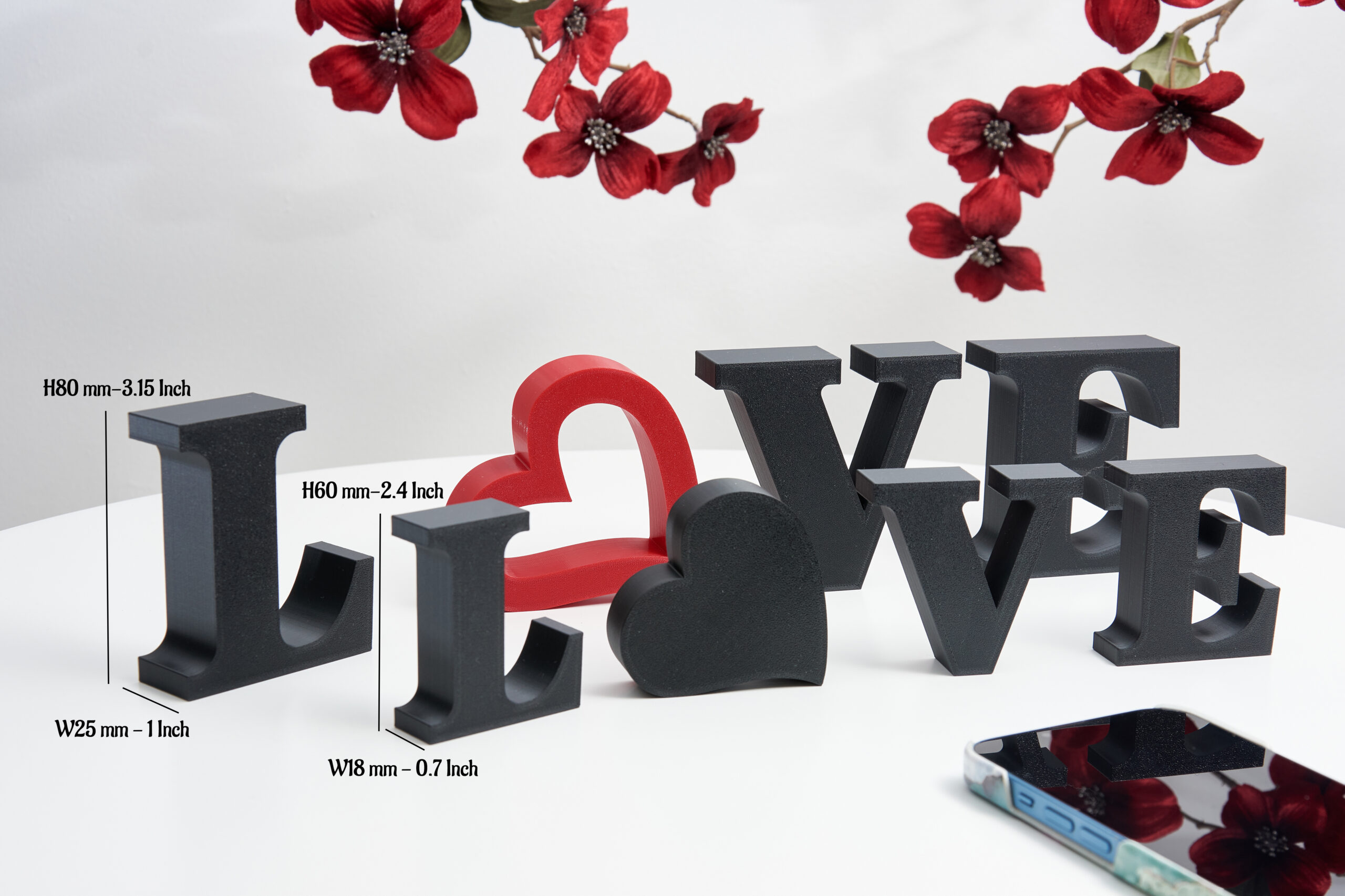 Letters can be made in 2 dimensions, H80mm and 60mm, heart can be monolith or holed inside.